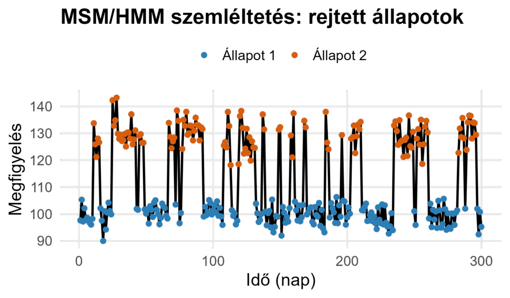 Leegyszerűsítve, az MSM modellek olyan idősor alapú modellek, amelyek feltételezik, hogy az adatok egy vagy több – akár rejtett – állapot között váltakoznak (pl. normális hőmérséklet vs. szélsőségesen magas hőmérséklet) és ezek az állapotok különböző tulajdonságokkal rendelkeznek. Az állapotok közötti átmenet egy Markov lánc irányítja, amely megadja az állapotok közötti átmenet valószínűségét.