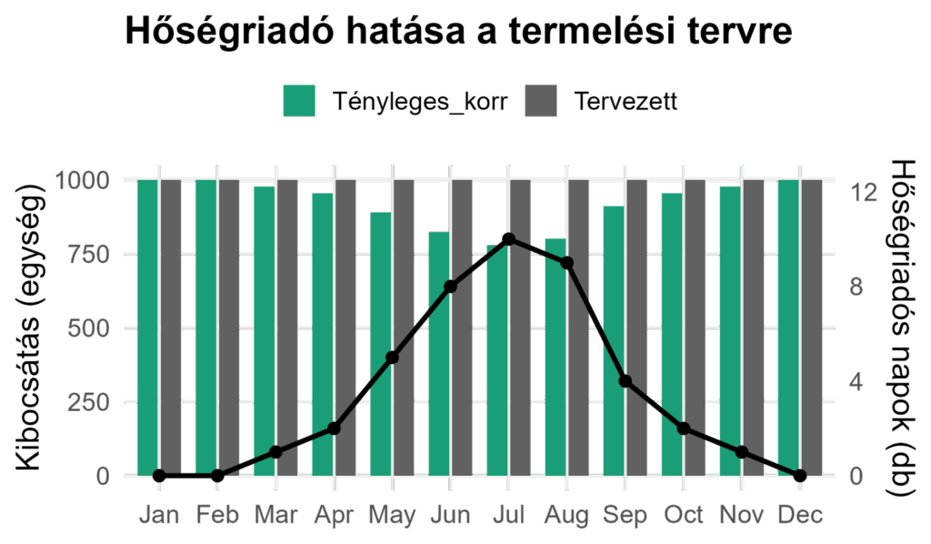 A példa alapján pl. a hőségriadós napok számának előrejelzése létfontosságú a termelési tervek validálásakor. Ugyanakkor szélsőségesen (nem lineárisan) változó körülmények szintén hatással lehetnek az éves tervezett kibocsátásra. Az időjárásnál maradva ilyen lehet pl. az intenzív csapadékos időszakot követő útlezárások időtartama, ami logisztika problémát jelenthet akár a nyersanyag beszerzésben, akár a késztermék szállítmányozásban.